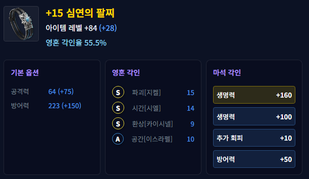 공간을 자유로 바꾸면 심연의 팔찌작은 끝~ 마석은 망하고 없어서 좀 여러개 모아서 한번에 마석영석작을 다시 해 줄 생각이다.